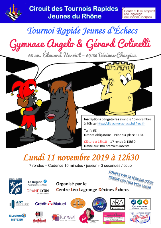 1re étape du Circuit Rapide Jeunes du Rhône, la 11e édition du tournoi jeunes du club de Décines aura lieu le lundi 11 novembre 2019. Permettant aux jeunes de découvrir la compétition, ce rapide se déroule sur une après midi : 7 rondes de 10 minutes + 3 secondes/coup réservées aux jeunes de Petits-Poussins à Cadets !
