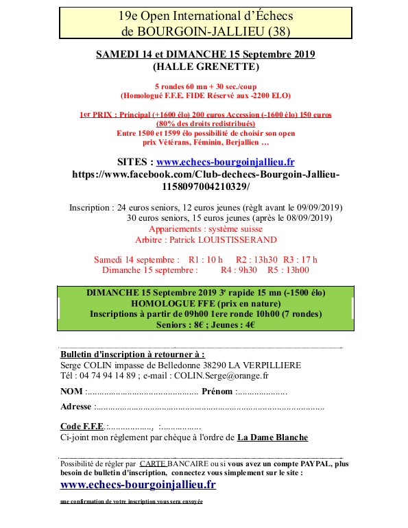 Le club d’Échecs LA DAME BLANCHE de BOURGOIN-JALLIEU organise son 19e Open International samedi 14 et dimanche 15 septembre 2019.