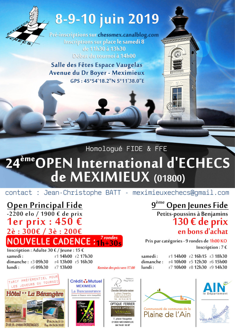 7 rondes de 1h + 30 secondes/coup pour le tournoi principal. Le tournoi Jeunes FIDE, réservé aux joueurs Petit-poussin à Benjamin se jouera en 9 rondes de 60 minutes.