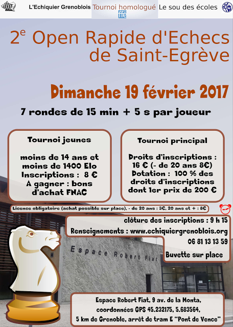 L’Échiquier Grenoblois a le plaisir de vous convier au 2e Open Rapide de Saint-Égrève.