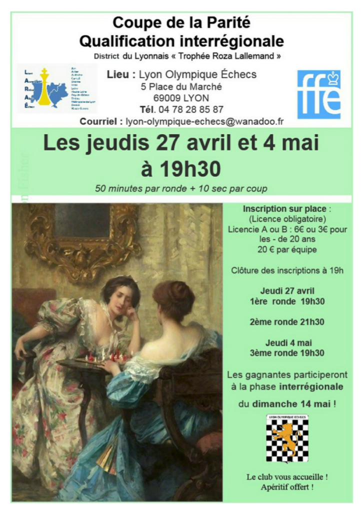 La phase ZID Lyonnais de la Coupe de la Parité aura lieu les jeudis 27 avril et 4 mai 2017 au Lyon Olympique Échecs. 1 équipe par tranche de 4 équipes participantes est qualifiée pour la phase interrégionale du 14 mai.