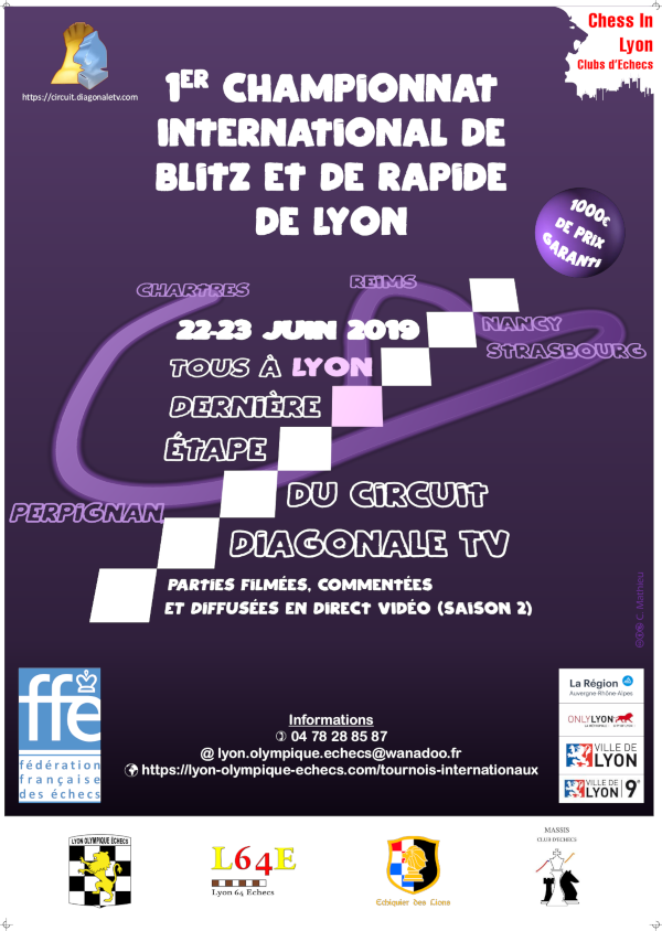 Le Lyon Olympique Échecs concrétise son rapprochement avec le Circuit DiagonaleTV. En effet, la société et le club d’Échecs se retrouveront autours des Championnats de Lyon de Rapide et de Blitz des samedi 22 et dimanche 23 juin 2019 ! Ainsi Diagonale TV retransmettra et commentera ces 2 deux tournois en direct avec l’organisation de 2 Finales dont la société a le secret.
