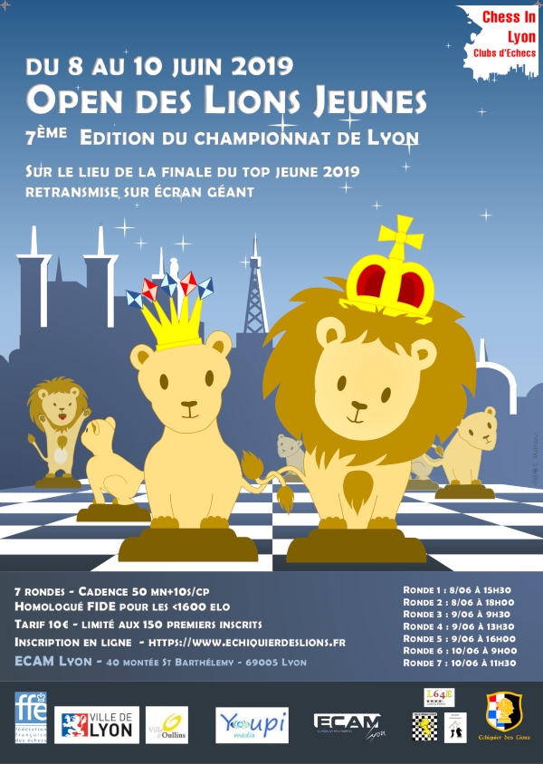 Il s’agit d’un tournoi réservé aux catégories jeunes et qui se jouera en 7 rondes de 50 min + 10 secondes/coup. Il s’agit de la 7e édition du Championnat de Lyon et il est organisé en parallèle de la phase finale du Top Jeunes 2019.