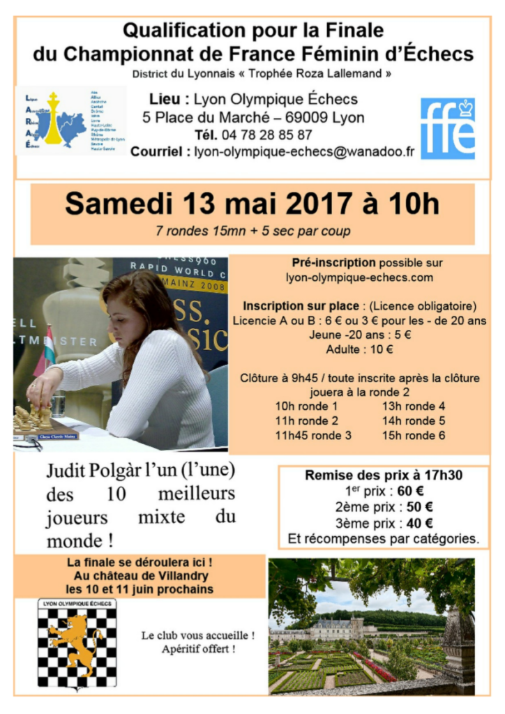 Le samedi 13 mai 2017, le Lyon Olympique Échecs organise la phase interdépartementale du Trophée Roza Lallemand. Ce tournoi destinée à toutes les joueuses des clubs de la Loire, de l’Ain et du Rhône est qualificatif pour le Championnat de France Féminin de Parties Rapides qui se déroulera les 10 et 11 juin prochains au Château de Villandry !
